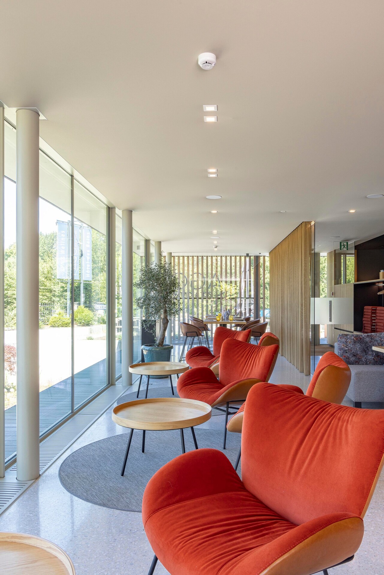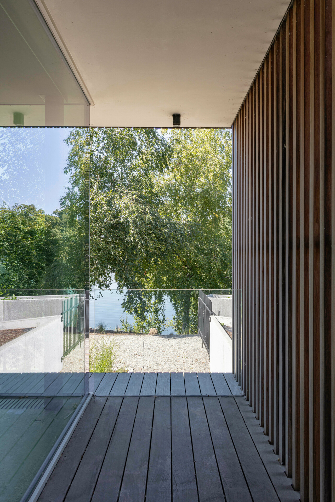 La structure, largement vitrée, maximise la transparence et crée un rapport direct avec le lac de Robertville, révélant des vues panoramiques qui évoluent au fil de la lumière et des saisons.