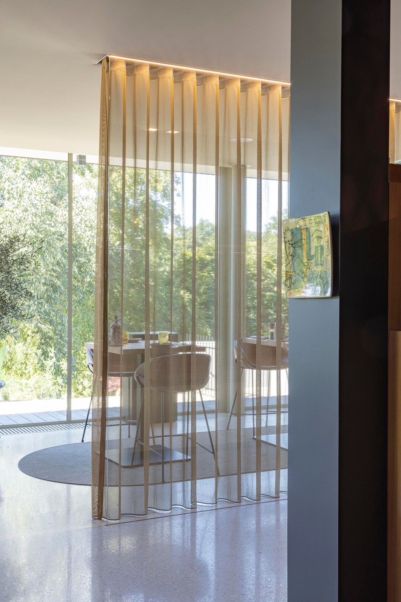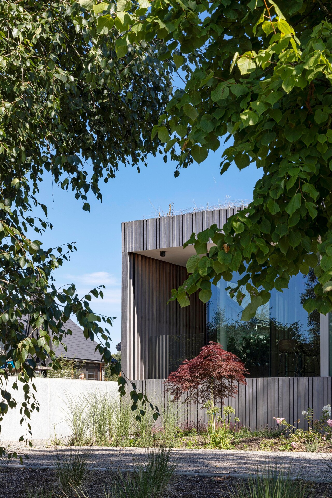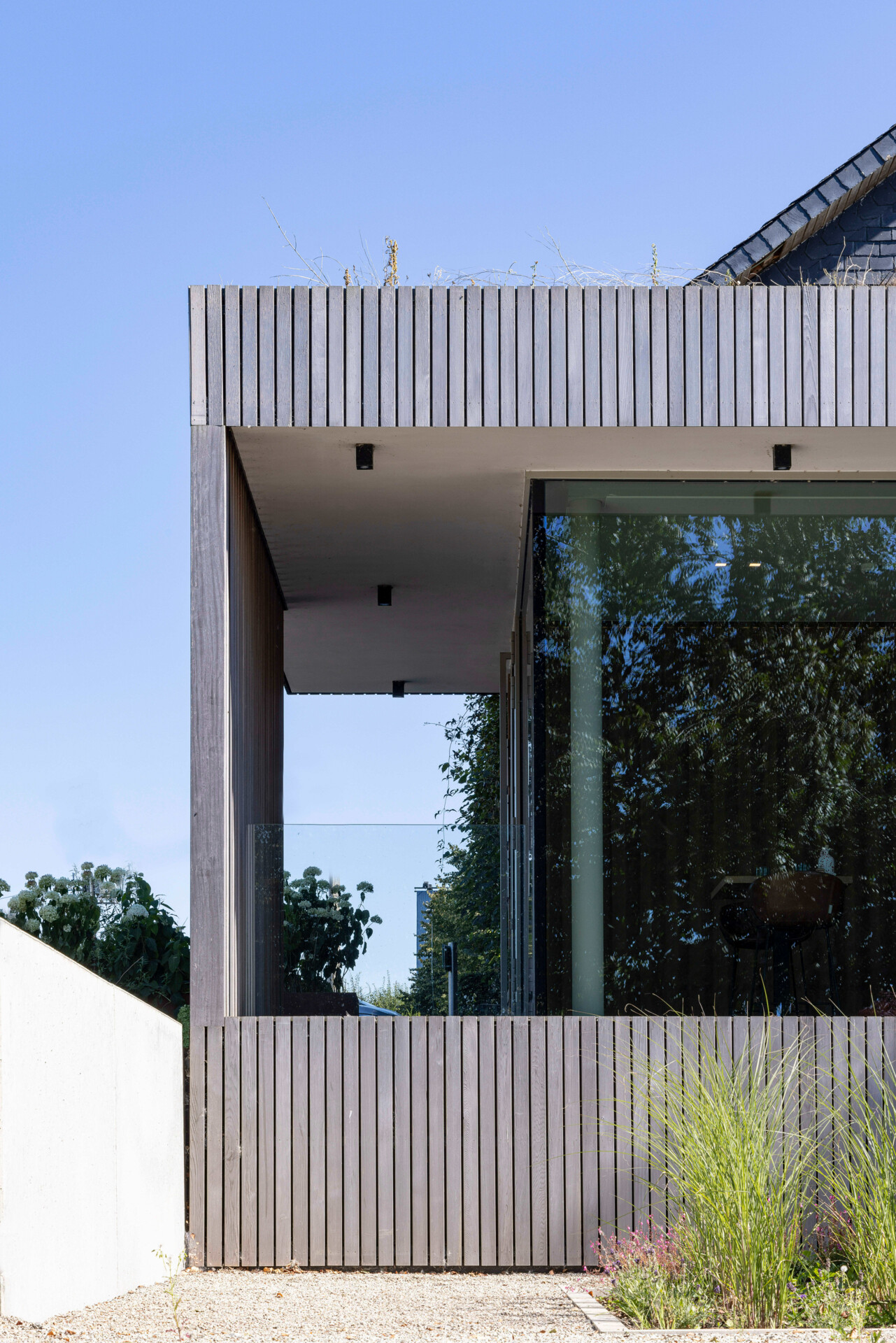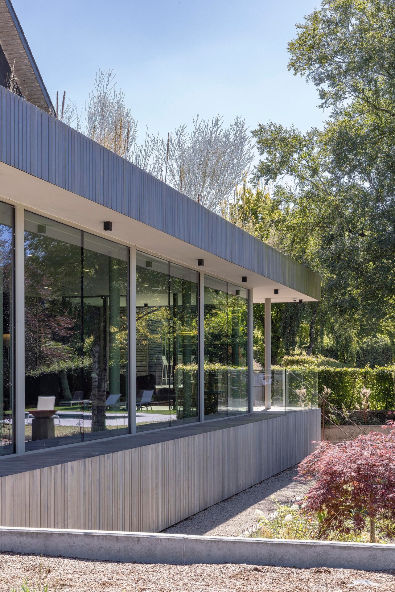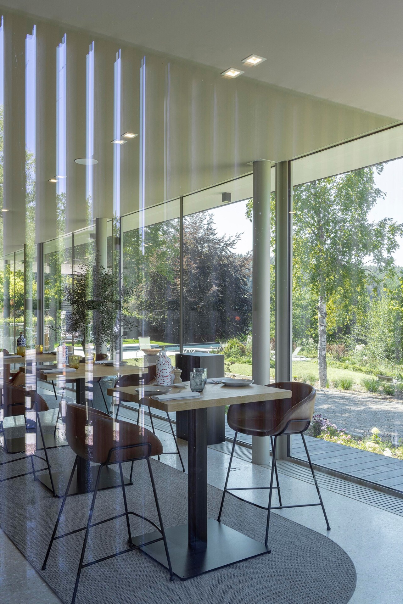 Entièrement vitrée, elle offre une présence chaleureuse tout en s’intégrant discrètement au jardin paysager qui l’entoure.