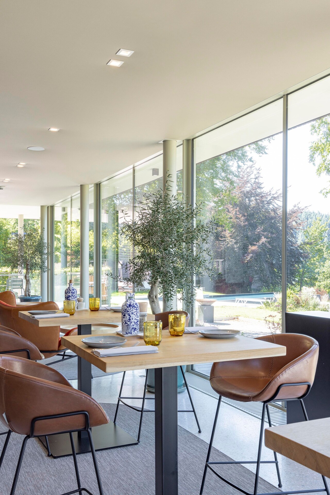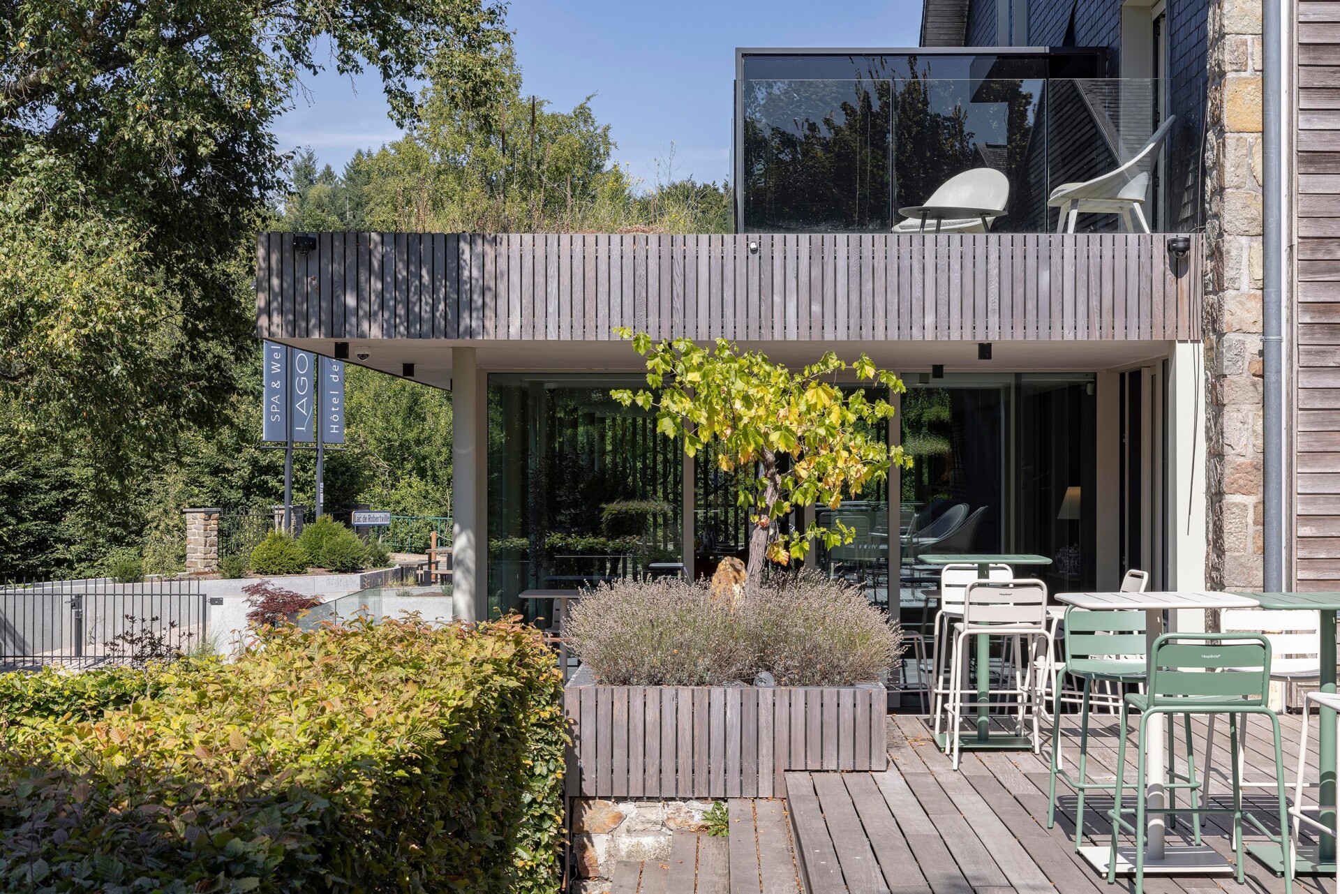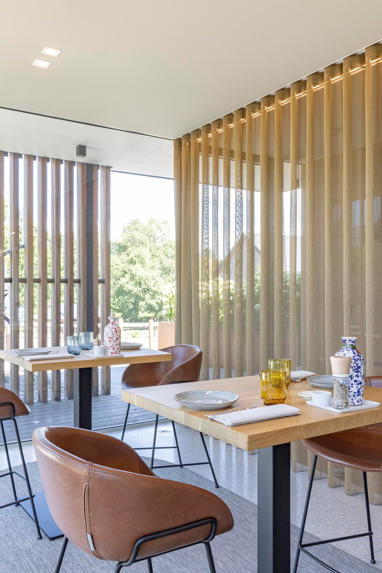 Conçue comme une extension d’un restaurant existant, cette annexe s’inscrit dans une démarche architecturale privilégiant la matérialité naturelle et l’ouverture sur le site.