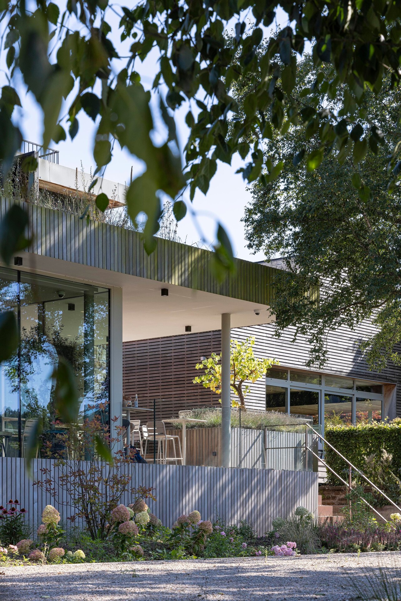 Une terrasse couverte prolonge l’annexe et offre un espace intermédiaire, abrité mais toujours connecté au paysage, idéal pour accueillir les usagers en toute saison.
