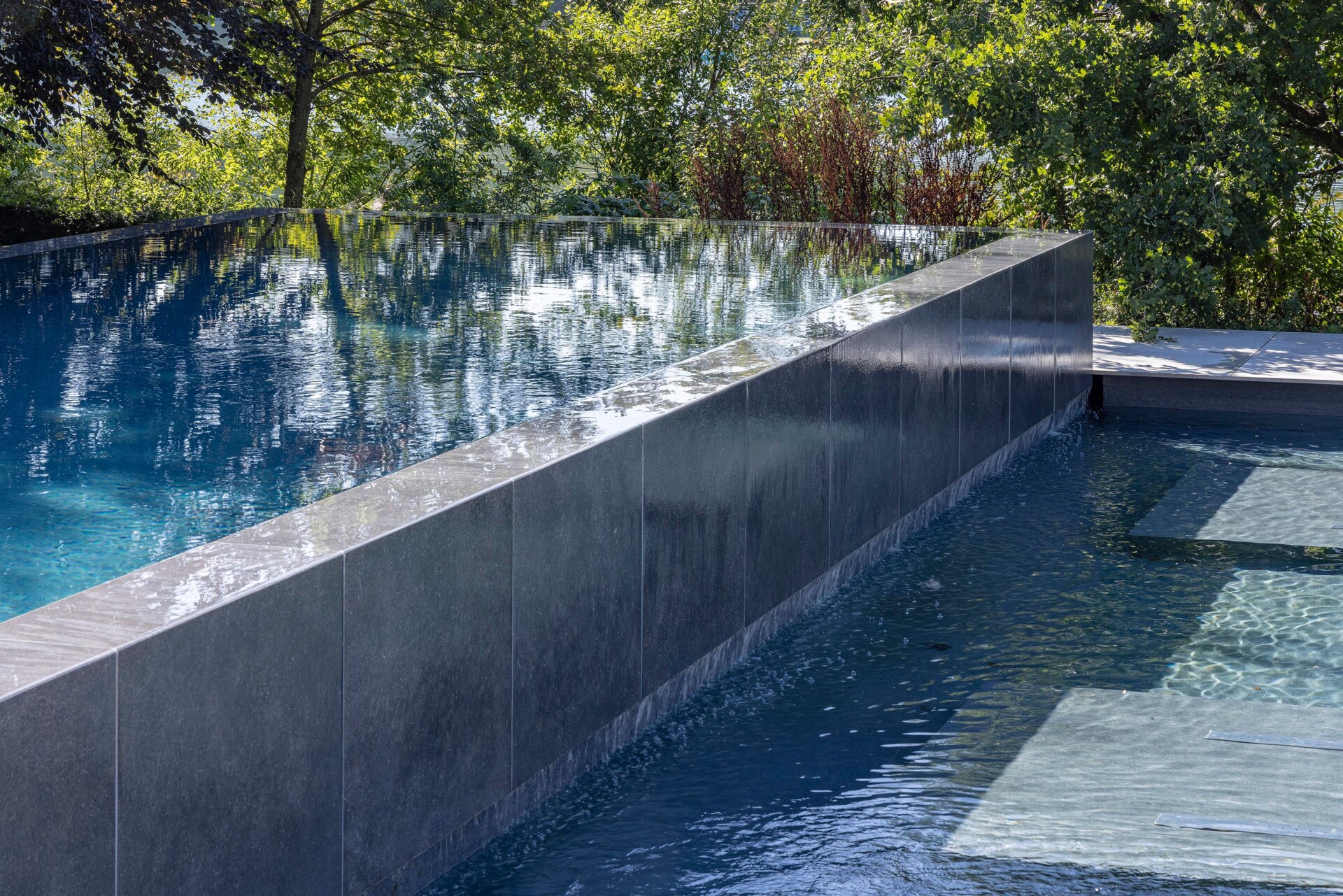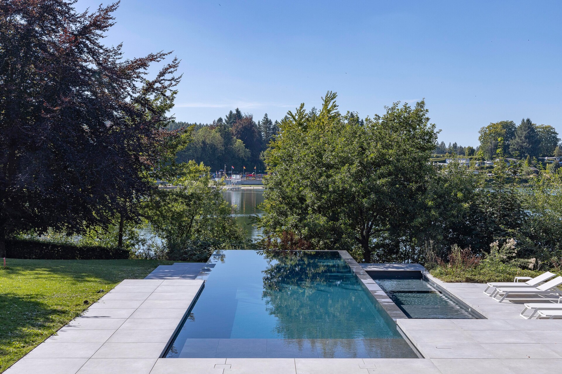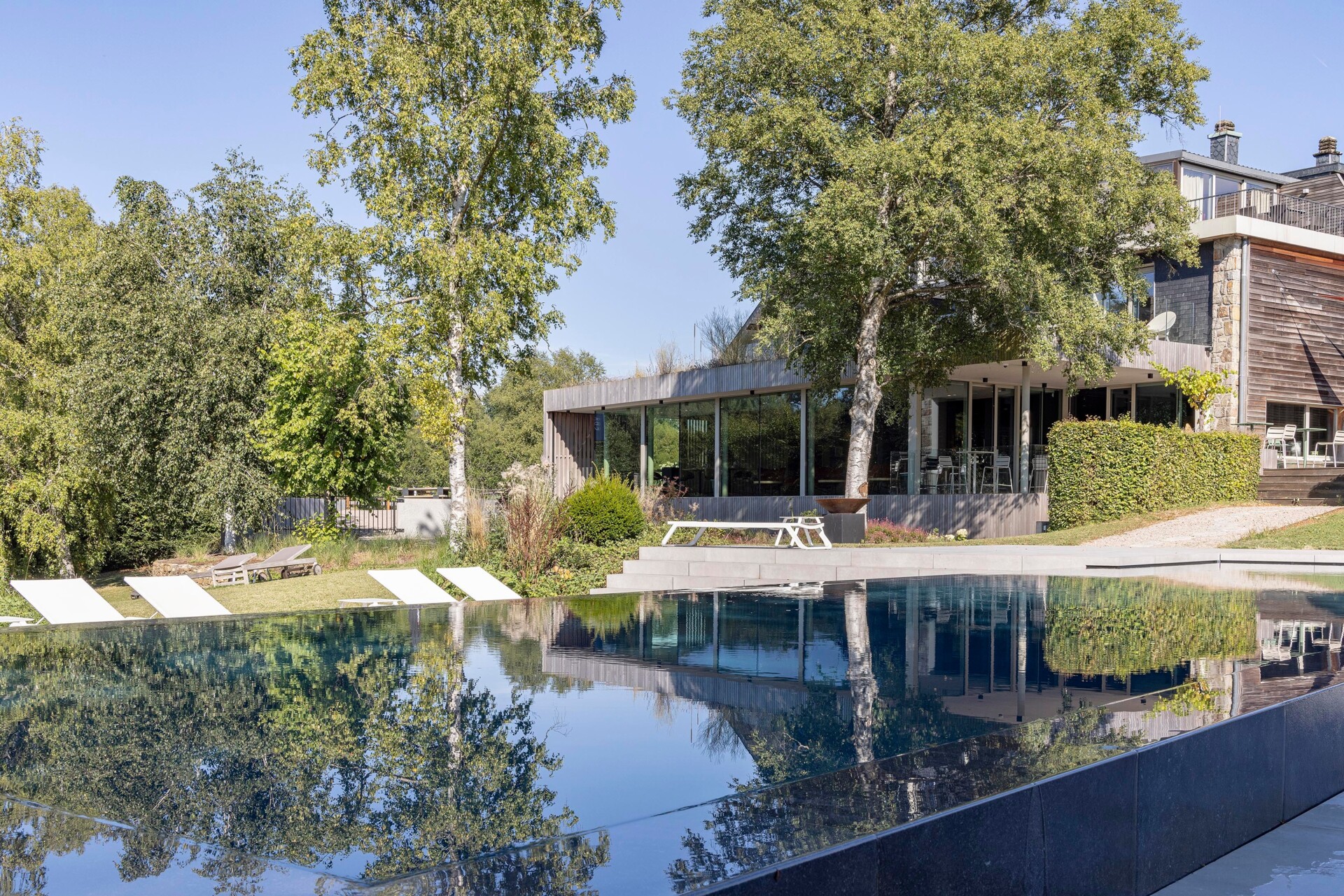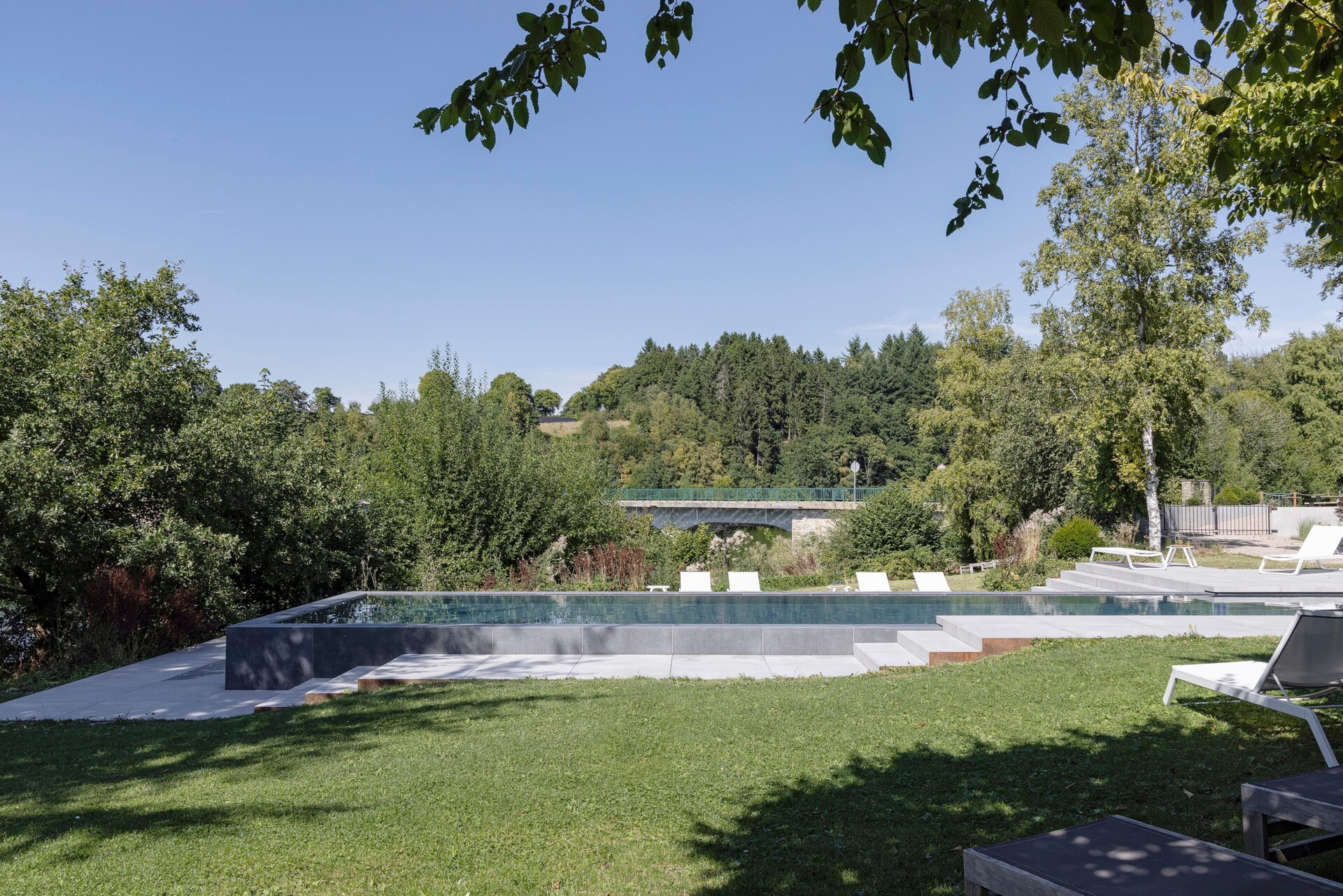 À proximité immédiate, une piscine comportant un double bassin, renforce l’atmosphère de détente du lieu et participe à la mise en scène de l’ensemble.
