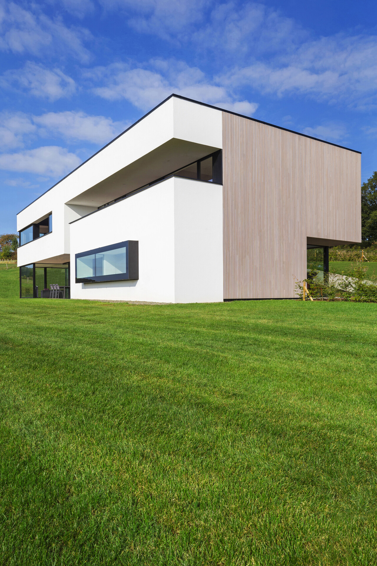 Le volume garage et son accès sont « enchâssés » dans le terrain afin de limiter leur impact, d’accentuer la simplicité du volume principal et de respecter au mieux le terrain naturel. Leurs surfaces sont recouvertes de végétation.