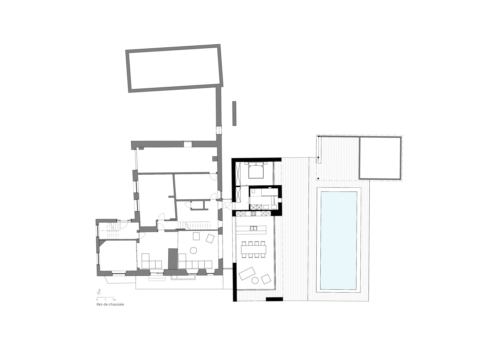 La petite jonction surbaissée entre l’ancien et le nouveau permet de conserver la pureté du volume à deux pans et d’éviter ainsi un enchevêtrement de toitures. Les vitrages latéraux permettent de conserver la lecture de la façade arrière en pierre aussi bien depuis l’intérieur que depuis l’extérieur.