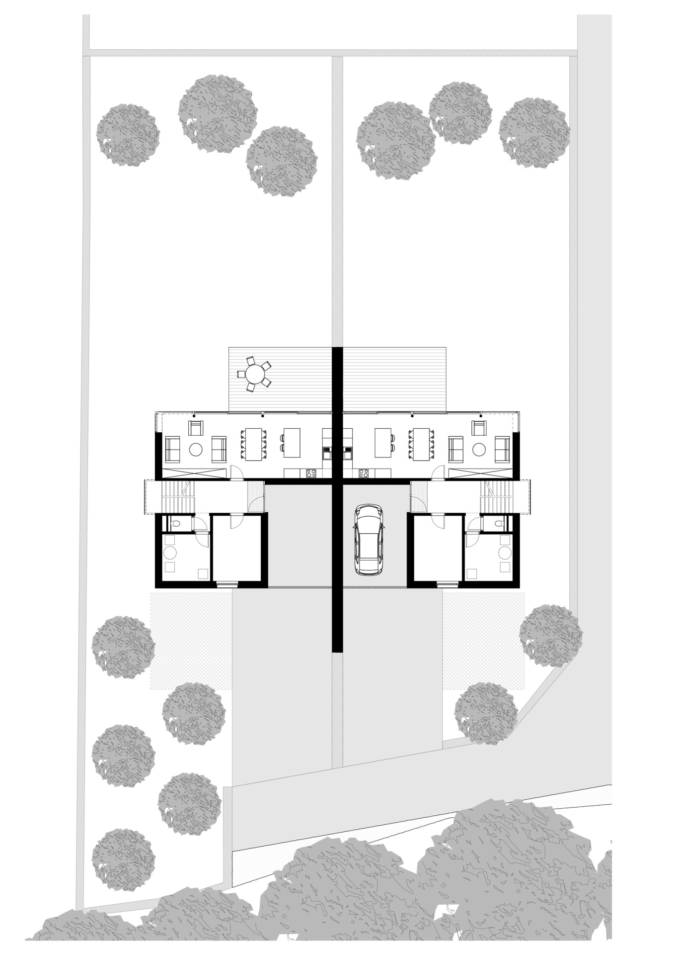 La limite mitoyenne entre habitations est matérialisée par un long mur en pierre traversant créant naturellement une intimité aussi bien côté entrée que côté jardin.