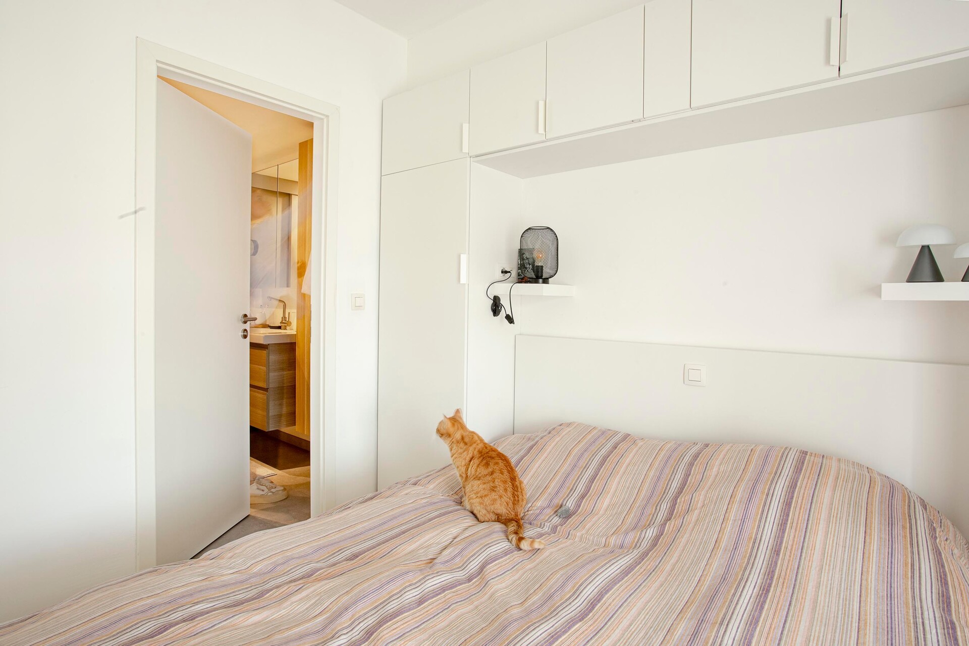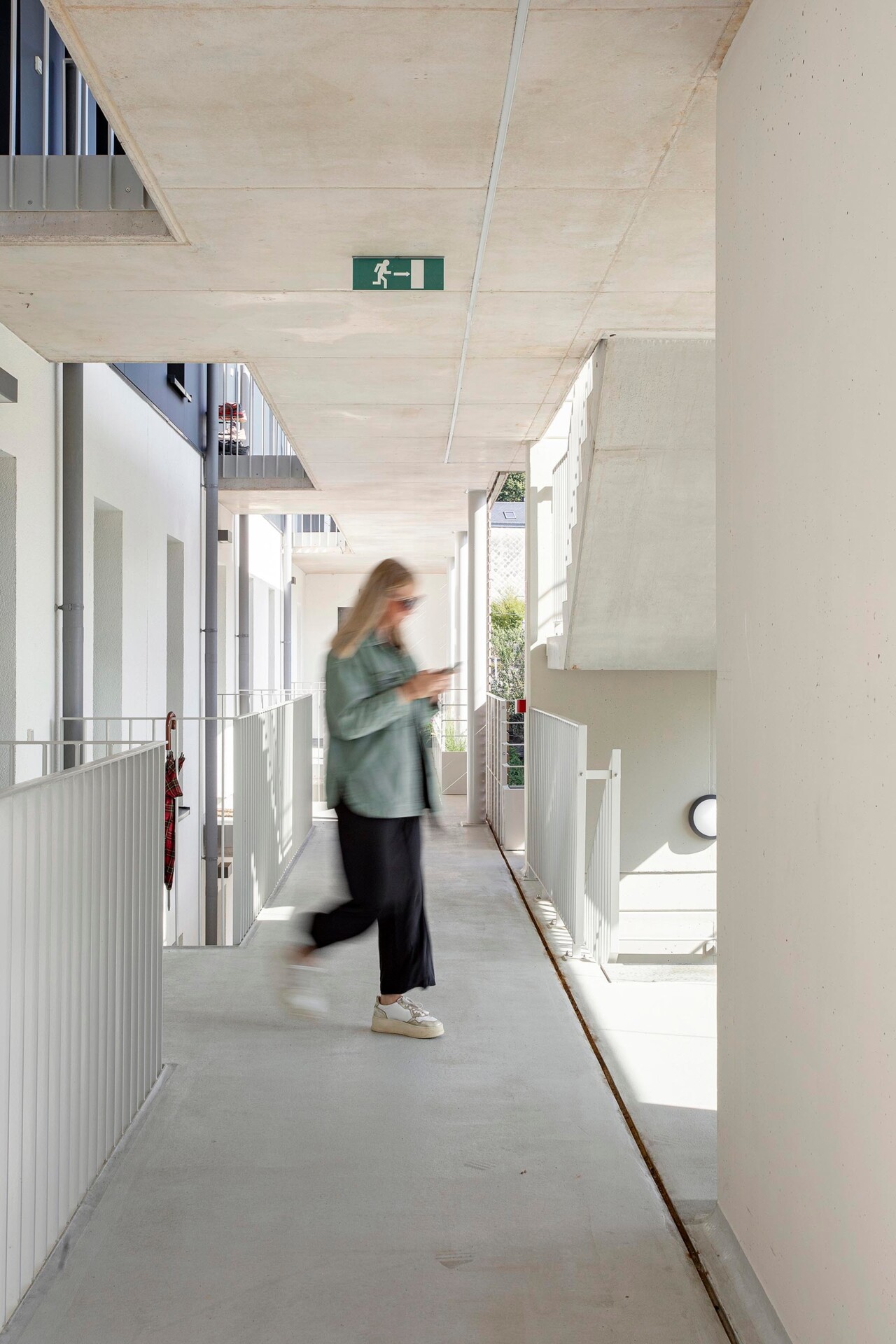 Dans cette zone à densifier, l’immeuble présente un gabarit R+3 plus volume en retrait. Ce dernier est bardé de manière différenciée afin d’accentuer l’effet de fuyantes. Le parement du volume principal est en crépi blanc et celui du volume toiture en panneaux ton gris. Une touche de finition bois est présente au niveau des garde-corps communs et privatifs. Ces choix de matériaux et de teintes sont dictés par un souci d’intégration à l’échelle du quartier et de la ville.