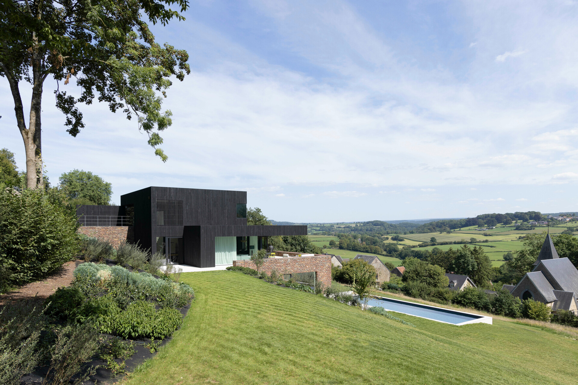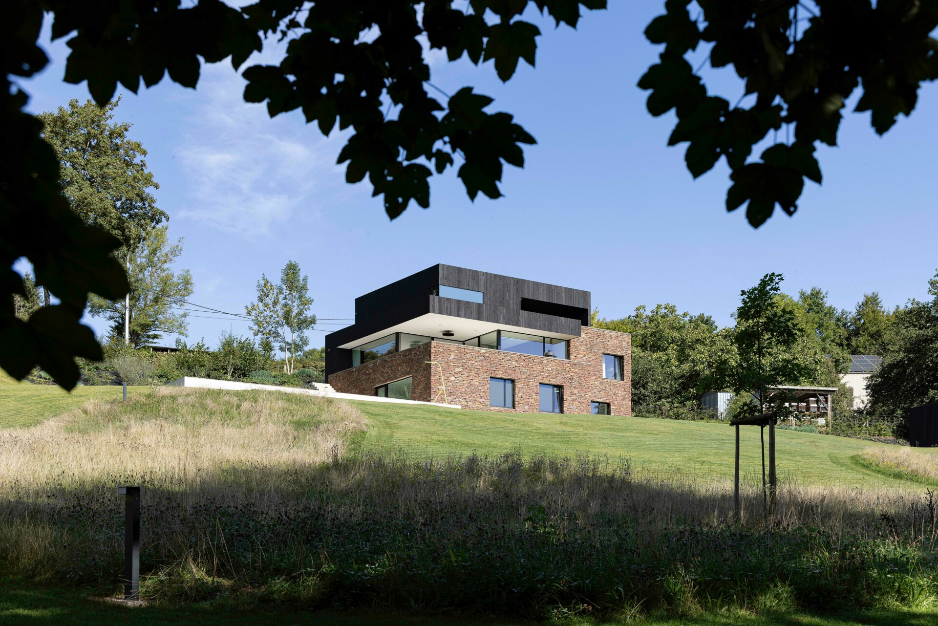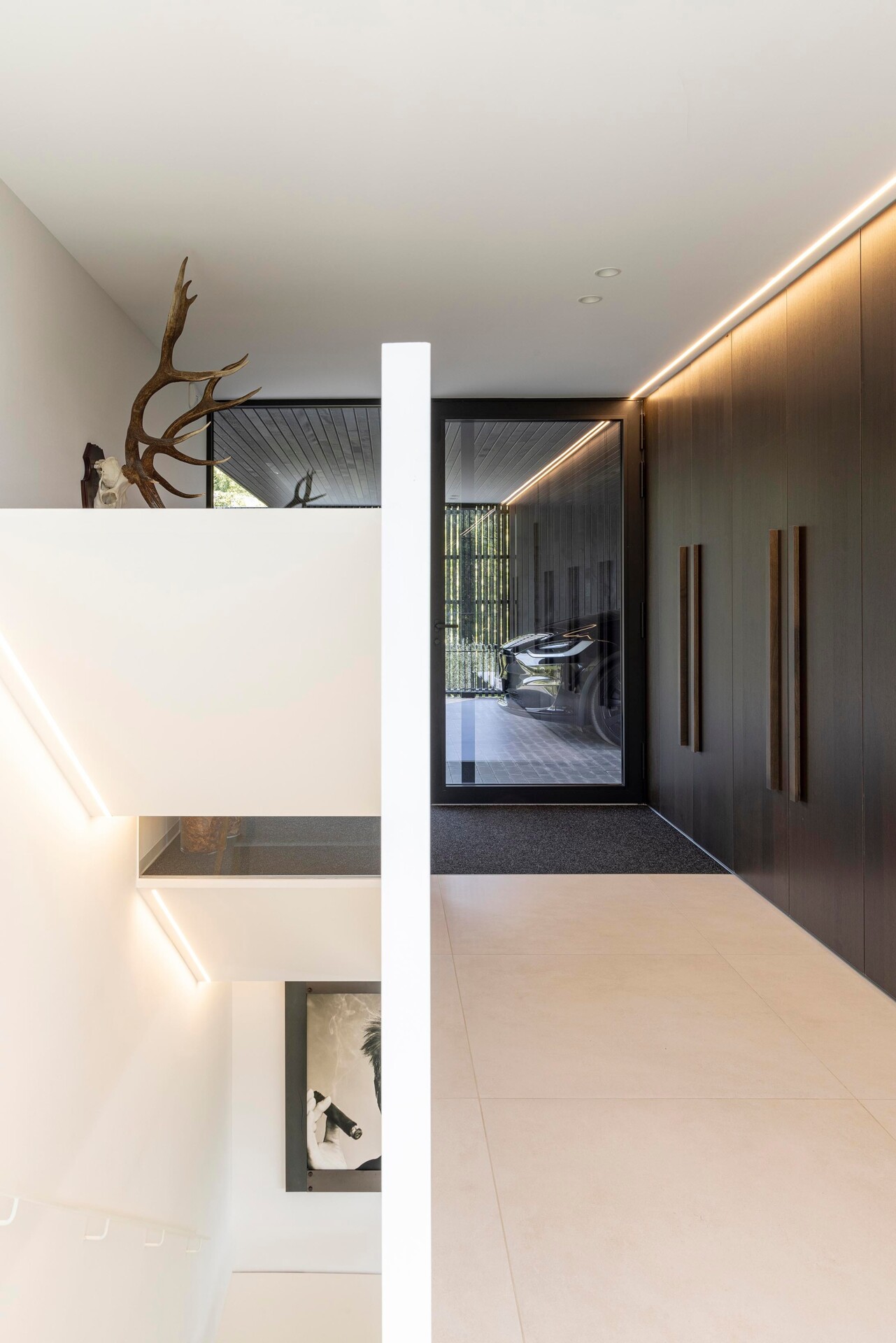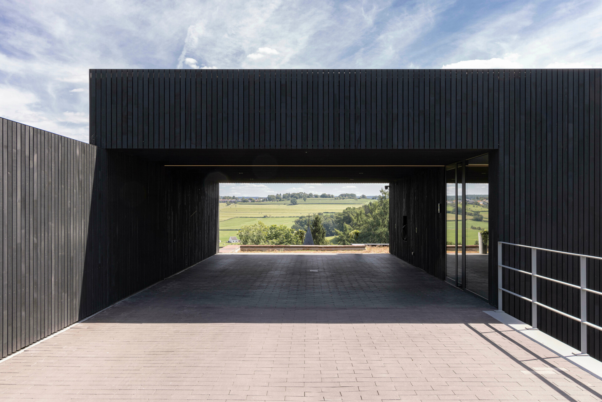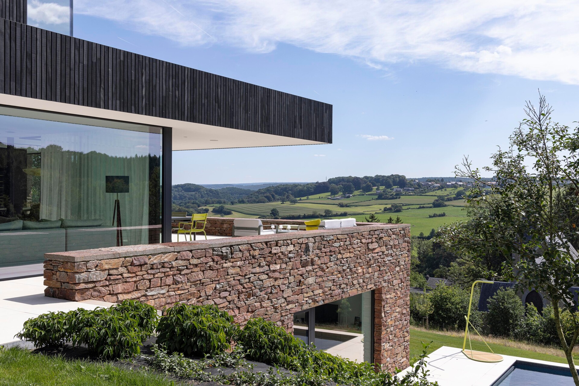 Le niveau à rue est volontairement de surface réduite, totalement traversant au niveau du carport et à toiture plate afin de préserver la vue sur la vallée.