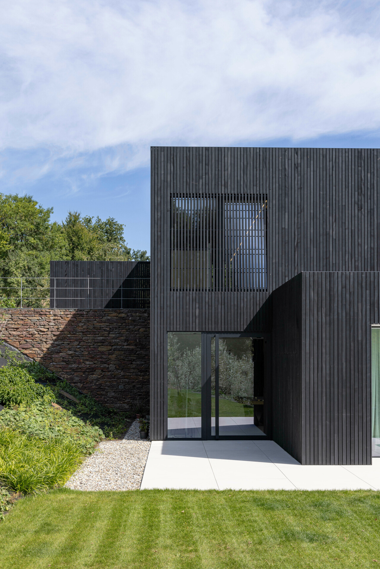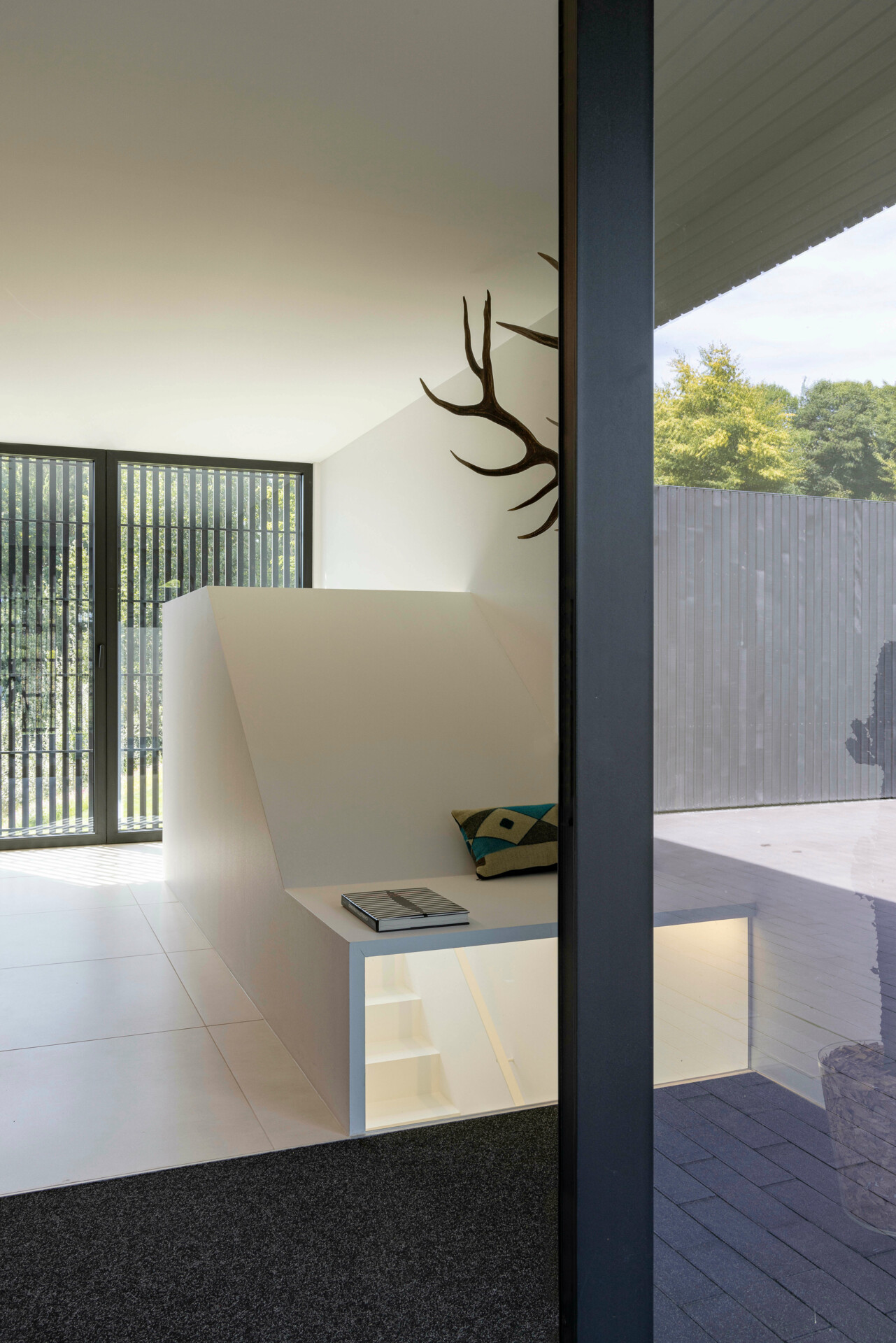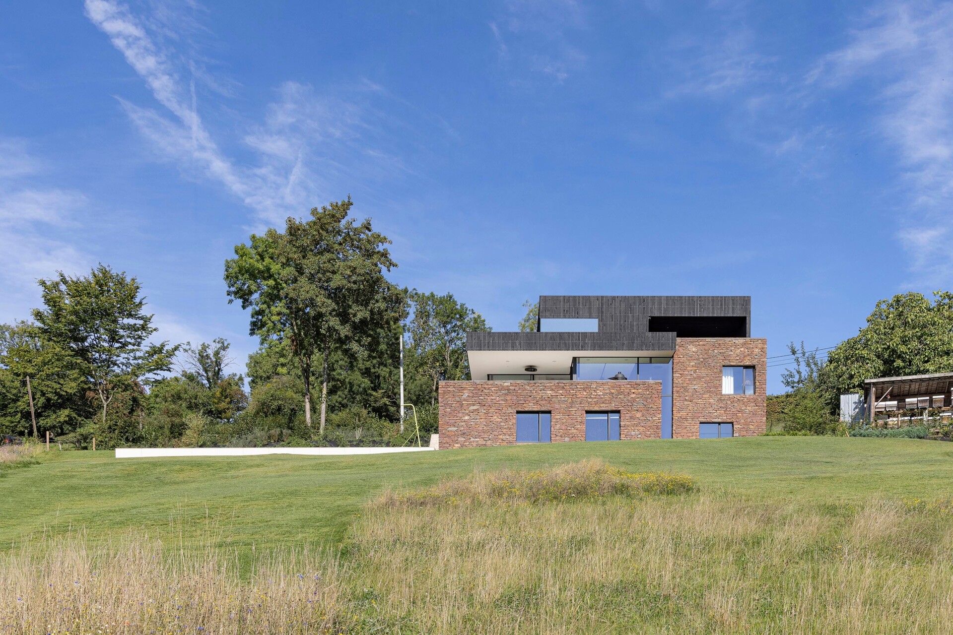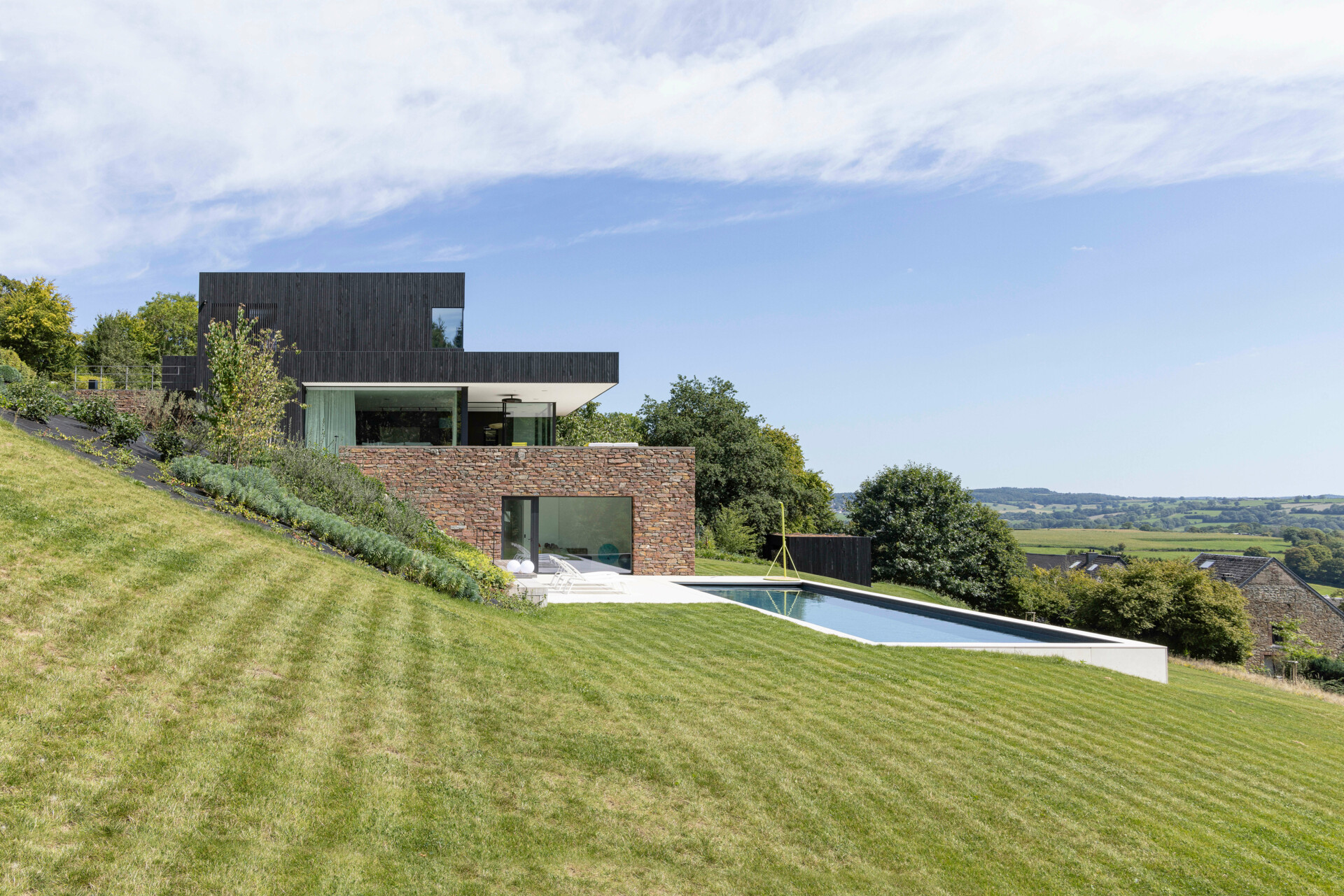 Le niveau à rue est volontairement de surface réduite, totalement traversant au niveau du carport et à toiture plate afin de préserver la vue sur la vallée.