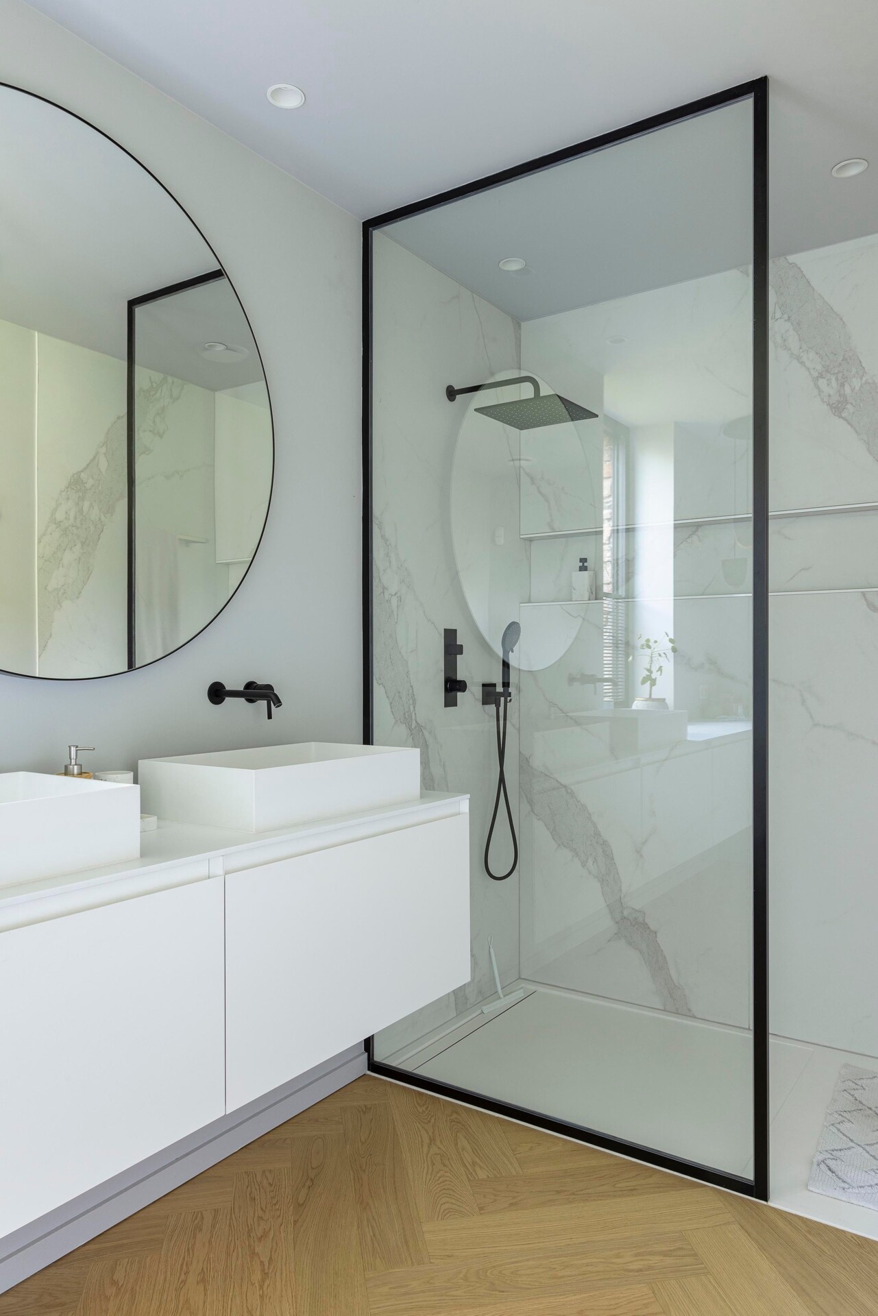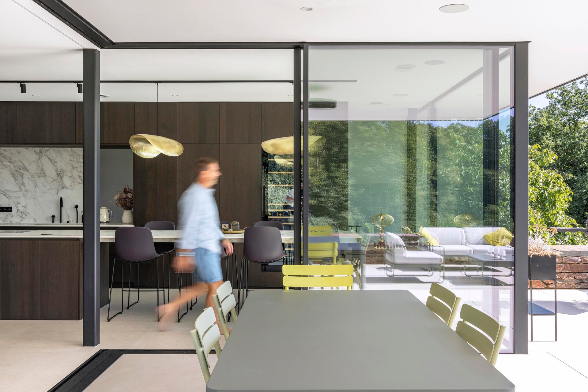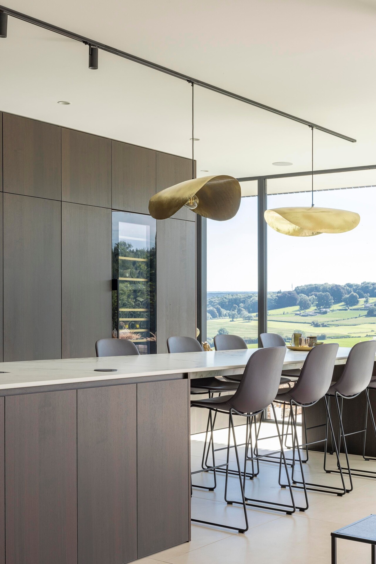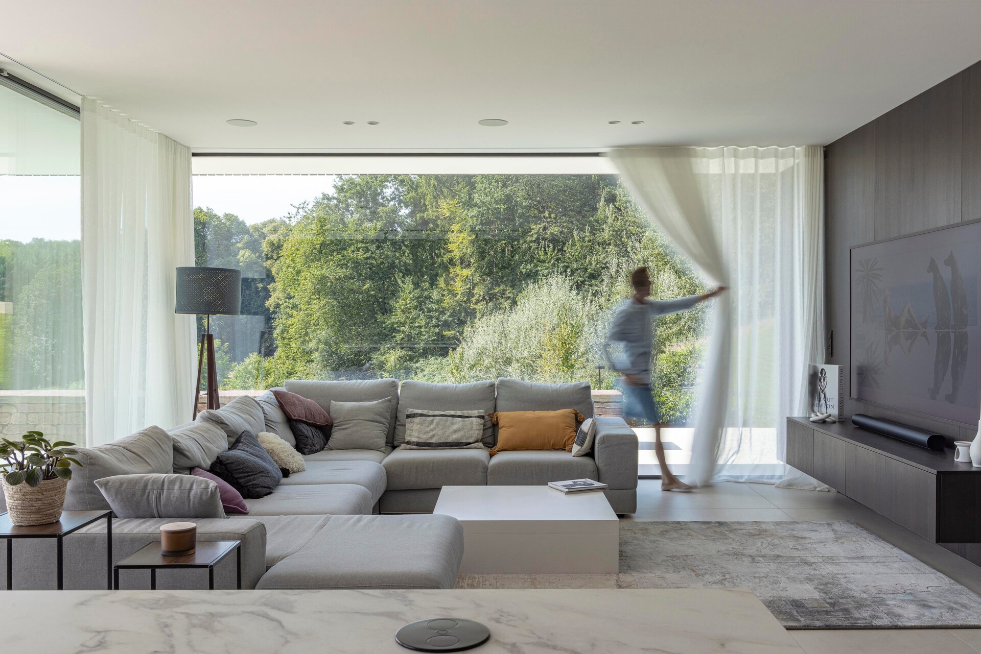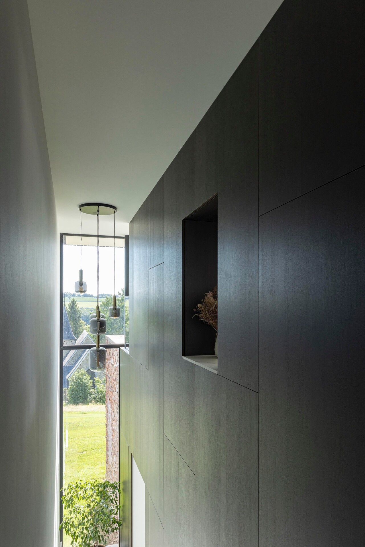 Le niveau à rue est volontairement de surface réduite, totalement traversant au niveau du carport et à toiture plate afin de préserver la vue sur la vallée.