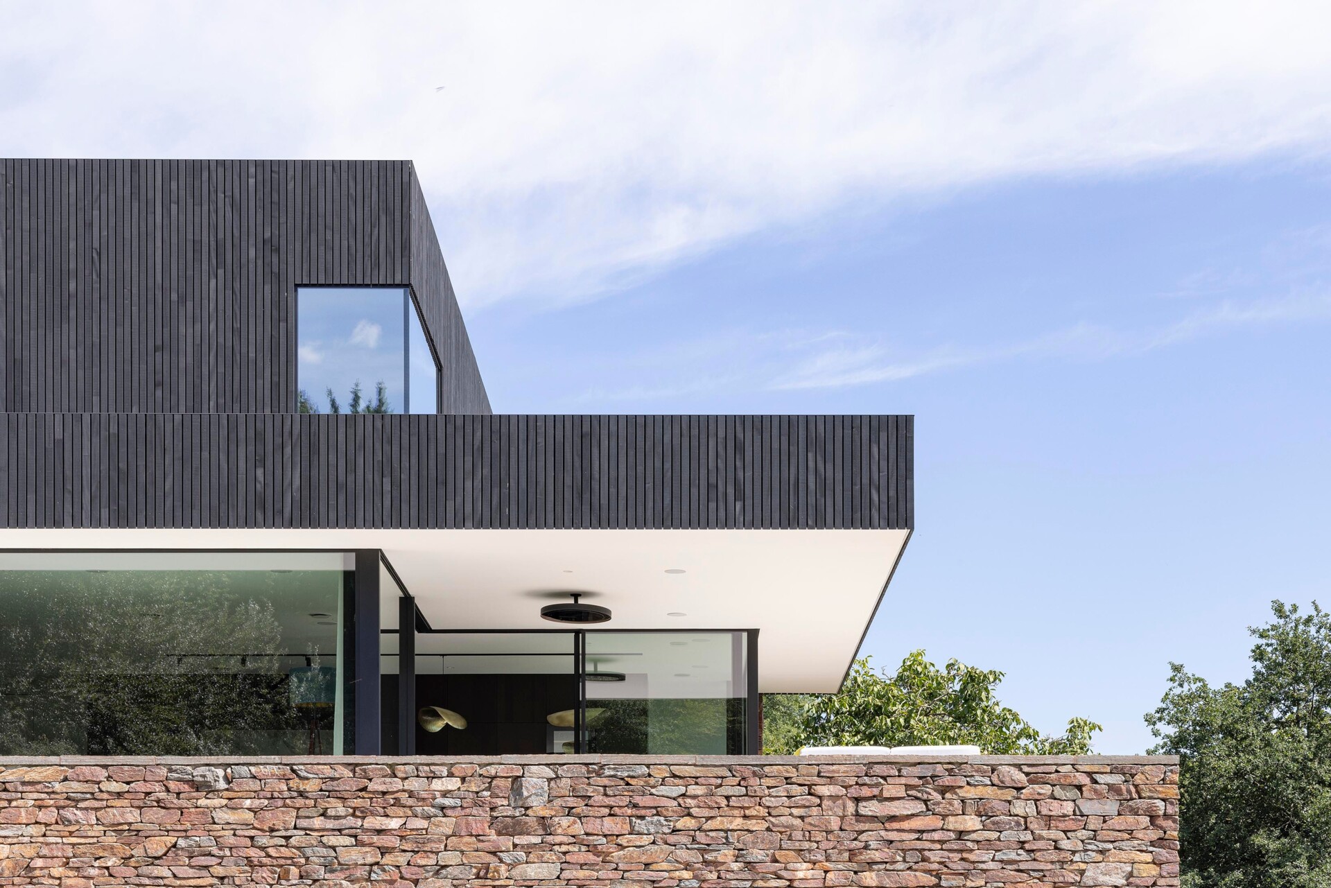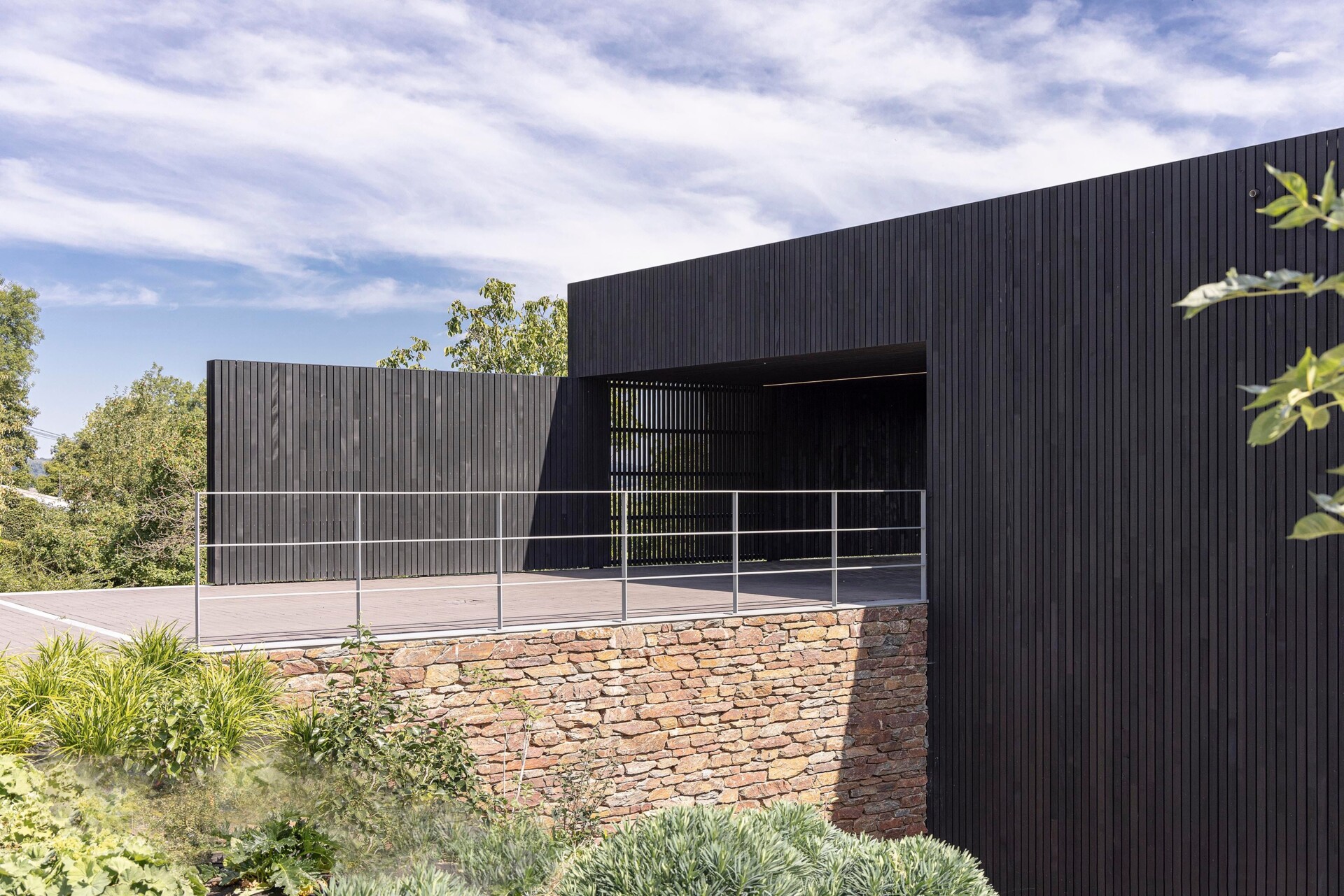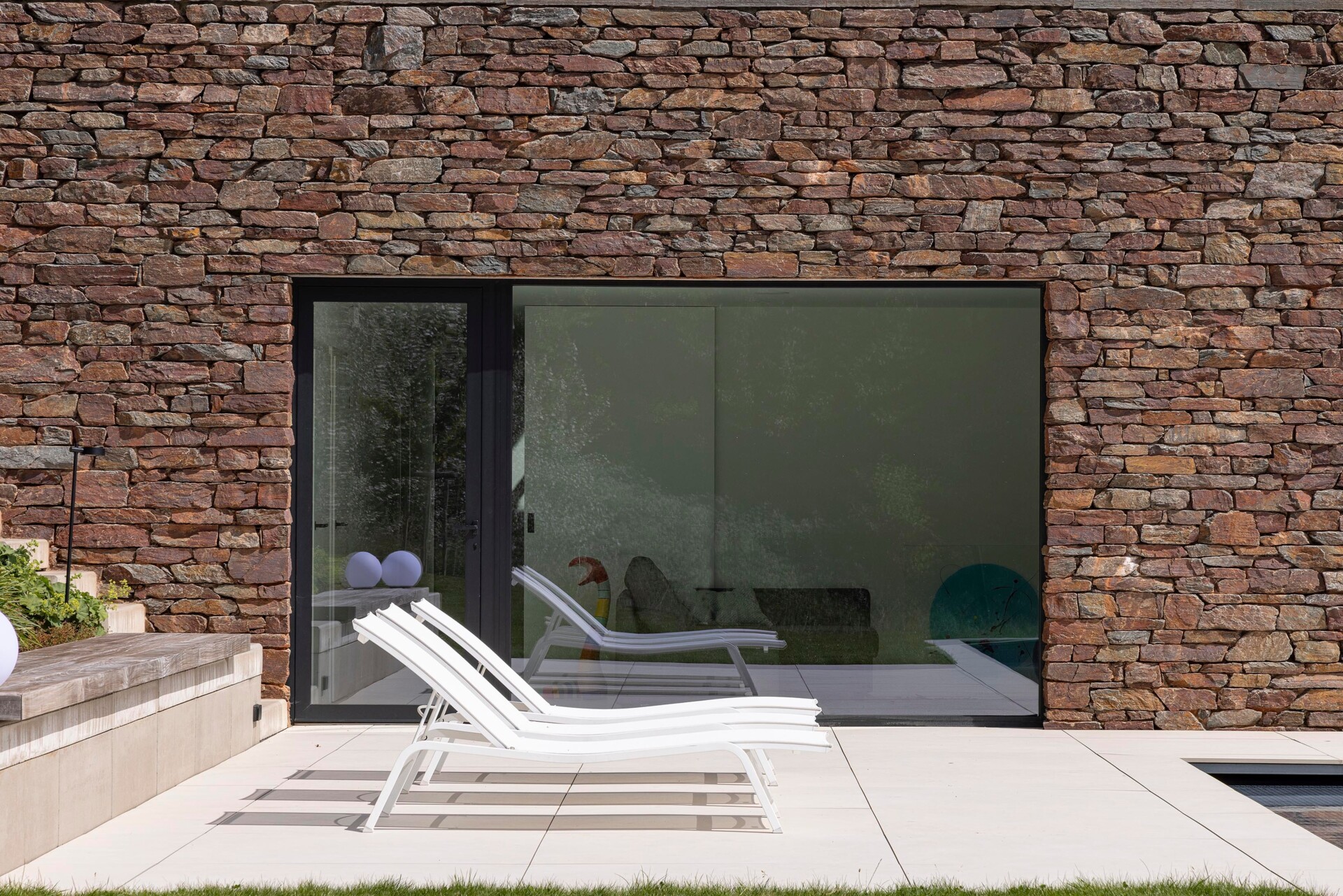 En référence aux constructions locales, les percements dans le parement pierre sont systématiquement ponctuels tandis que les grandes baies vitrées continues prennent place dans les zones bardées de bois. Une attention particulière a été apportée au dialogue visuel et physique entre les espaces intérieurs et extérieurs.