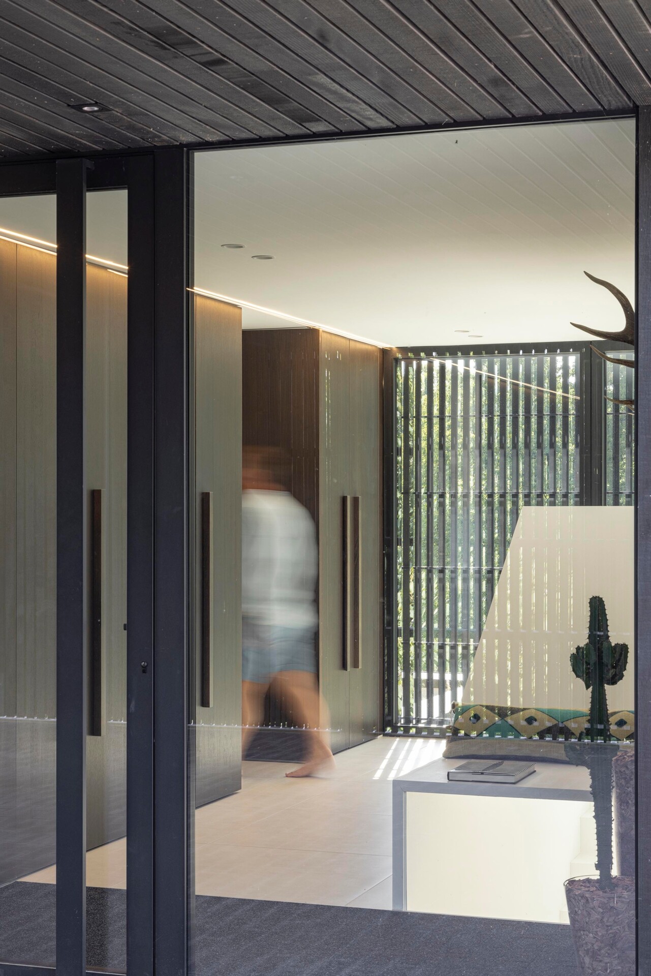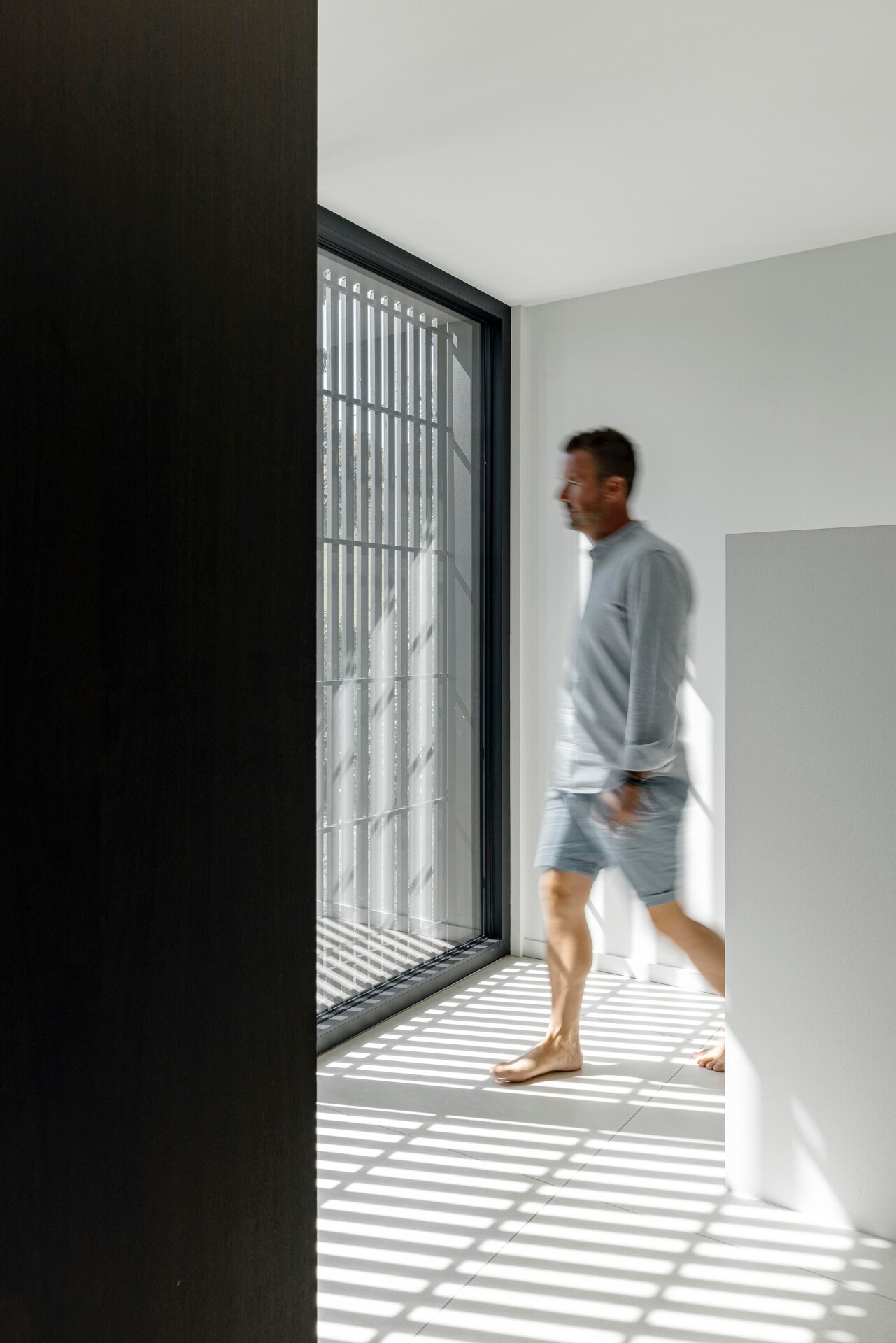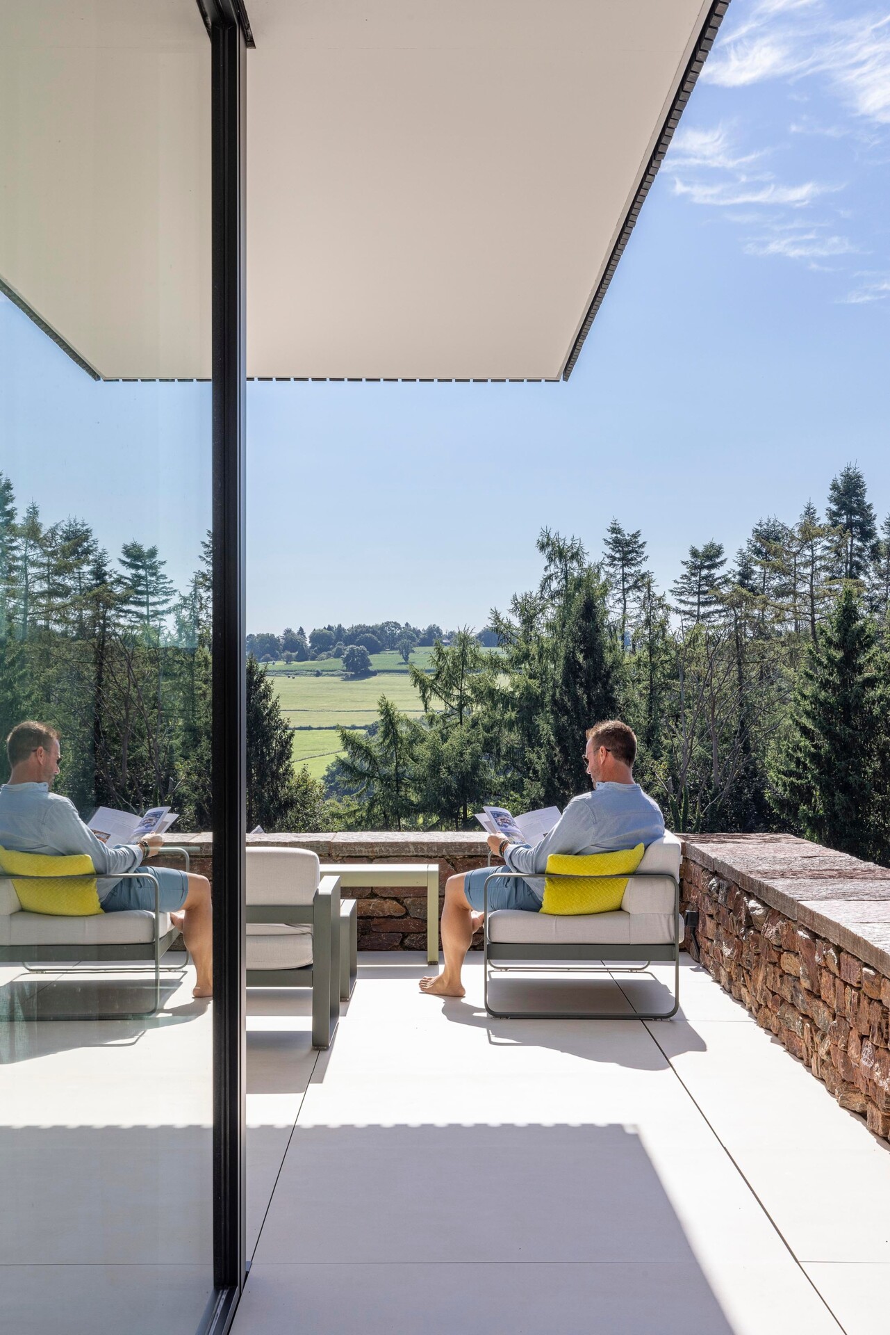 En référence aux constructions locales, les percements dans le parement pierre sont systématiquement ponctuels tandis que les grandes baies vitrées continues prennent place dans les zones bardées de bois. Une attention particulière a été apportée au dialogue visuel et physique entre les espaces intérieurs et extérieurs.